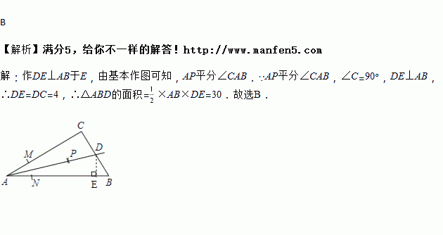 MN的长为半径作圆弧,在∠BAC内,两弧交于点P;③作射线AP交边BC于点D,若CD=4,AB=15,则△ABD的面积是( )