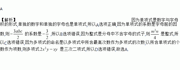 C. 不是整式 D. 多项式2x2y-xy是五次二项式
