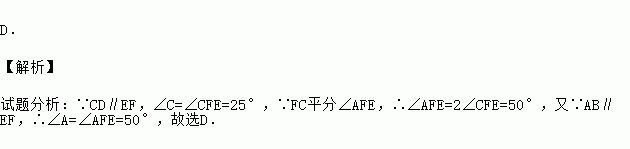 如图,已知AB∥CD∥EF,FC平分∠AFE,∠C=25°,则∠A的度数是( )