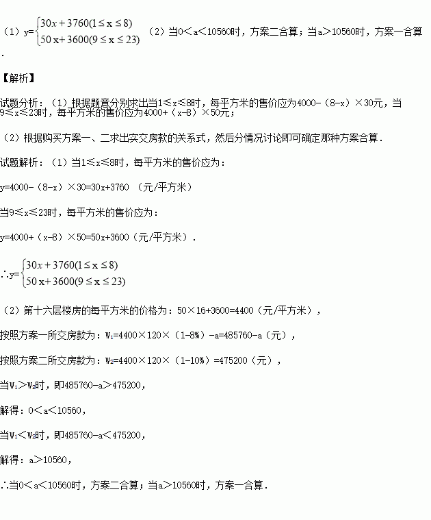 新农村社区改造中,有一部分楼盘要对外销售,某楼盘共23层,销售价格如下:第八层楼房售价为4000元/米2,从第八层起每上升一层,每平方米的售价提高50元;反之,楼层每下降一层,每平方米的售价降低30元,已知该楼盘每套楼房面积均为120米2.