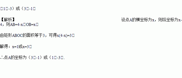 如图,已知点A是一次函数y=x—4在第四象限的图像的一个动点,且矩形ABOC的面积为3,则A点坐标为_____.