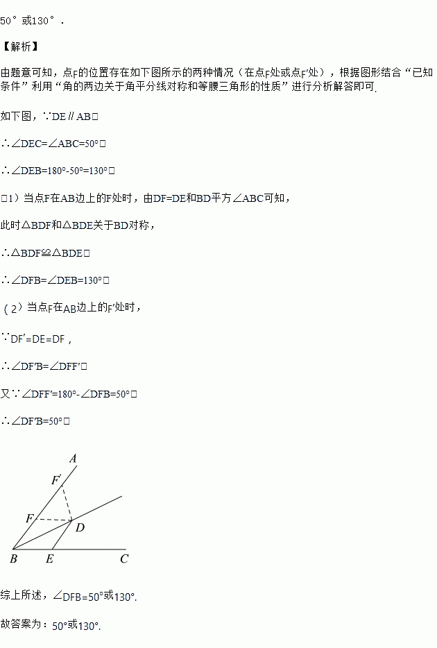 如图,∠ABC=50°,BD平分∠ABC,过D作DE∥AB交BC于点E,若点F在AB上,且满足DF=DE,则∠DFB的度数为_____.
