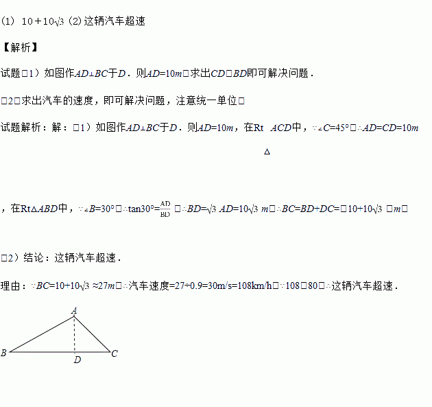 如图所示,某公路检测中心在一事故多发地段安装了一个测速仪器,检测点设在距离公路10 m的A处,测得一辆汽车从B处行驶到C处所用时间为0.9 s,已知∠B=30°,∠C=45°.