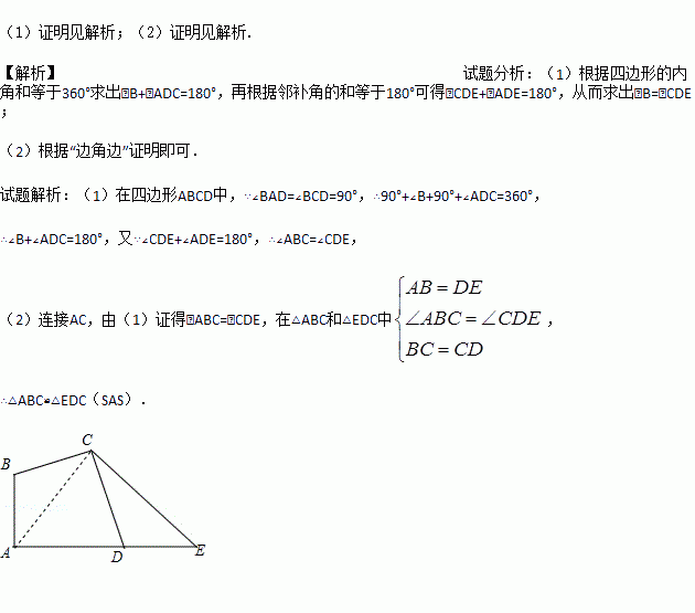 查看答案如图,在四边形ABCD中,∠A=∠BCD=90°,BC=DC,延长AD到E,使DE=AB.