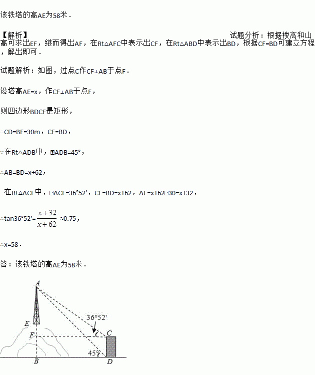 如图所示,某教学活动小组选定测量山顶铁塔AE的高,他们在30m高的楼CD的底部点D测得塔顶A的仰角为45°,在楼顶C测得塔顶A的仰角为36°52′.若小山高BE=62m,楼的底部D与山脚在同一水平面上,求铁塔的高AE.(参考数据:sin36°52′≈0.60,tan36°52′≈0.75)