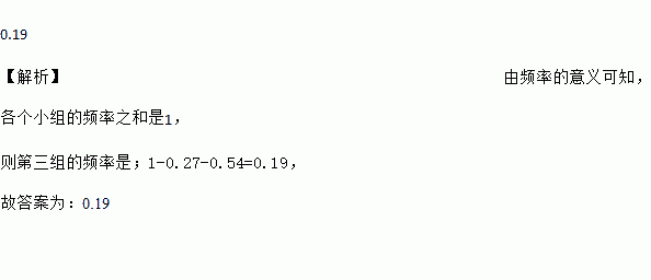 将一批数据分成5组,列出分布表,其中第一组与第五组的频率之和是0.27,第二与第四组的频率之和是0.54,那么第三组的频率是 。