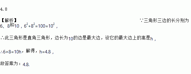 4.8 【解析】∵三角形三边的长分别为6、8和10,62+82=100=102, ∴此三角形是直角三角形,边长为10的边是最大边,设它的最大边上的高是h, ∴6×8=10h,解得,h=4.8, 故答案为:4.8.