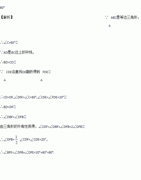 如图,△ABC是等边三角形,AD是BC边上的中线,点E在AC上,且∠CDE=20°,现将△CDE沿直线DE折叠得到△FDE,连结BF.∠BFE的度数是_______________.