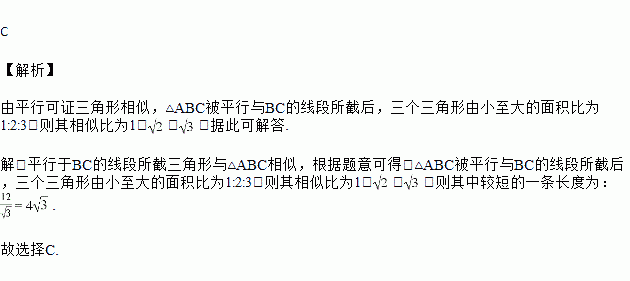 △ABC的面积被平行于BC的两条线段三等分,如果BC=12cm,那么这两条线段中较短的一条的长是( )