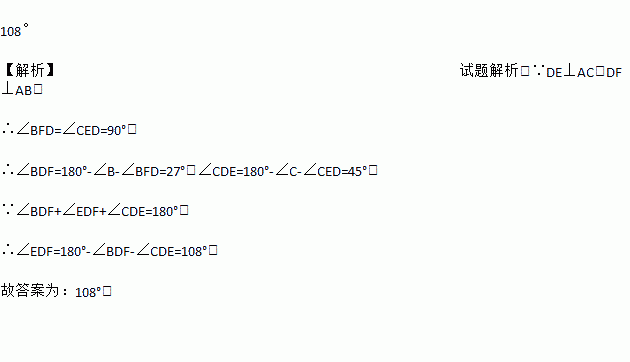 如图,在△ABC中,∠B=63º,∠C=45º,DE⊥AC于E,DF⊥AB于F,那么∠EDF=___________.