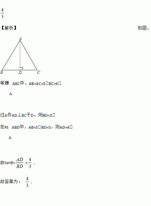 已知在中,AB= AC=5,BC=6,则tanB的值为_____.