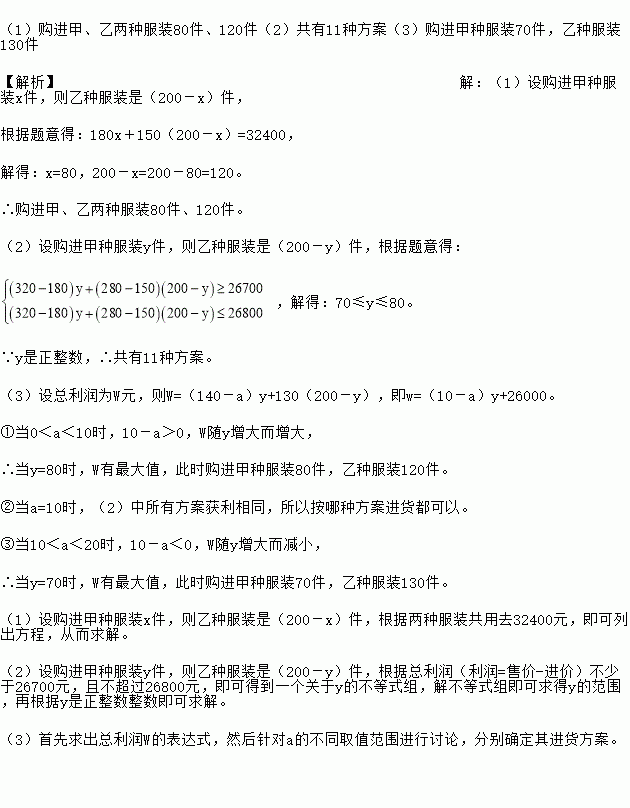 (2)该专卖店为使甲、乙两种服装共200件的总利润(利润=售价一进价)不少于26700元, 且不超过26800元,则该专卖店有几种进货方案?