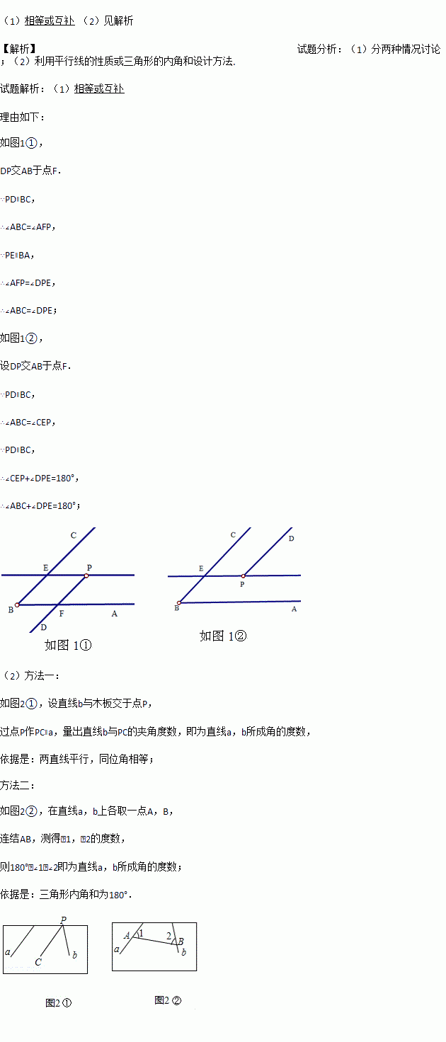 (1)如图1,P是∠ABC内一点,请过点P画射线PD,使PD∥BC;过点P画直线PE∥BA,交BC于点E.请画图并通过观察思考后你发现∠ABC与∠DPE的大小关系是 ,并说明理由.