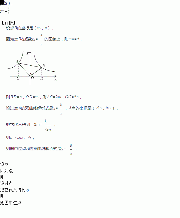 如图所示,Rt△AOB中,∠AOB=90°,OA=4,OB=2,点B在反比例函数y=图象上,则图中过点A的双曲线解析式是_____.