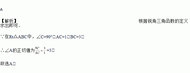 在Rt△ABC中,∠C=90°,AC=1,BC=3,则∠A的正切值为( )