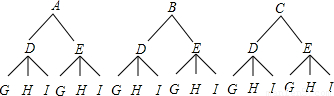 有三组纸牌,第一组有三张分别写有字母A,B和C,第二组有两张分别写有字母D和E,第三组有三张分别写有字母G,H,I.它们的背面一样.将它们的背面朝上分别重新洗牌后.再从三组牌中各摸出一张.(1)用树形图列举所有可能出现的结果;