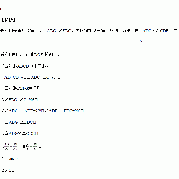 如图,四边形ABCD是边长为6的正方形,点E为边BC上的点,以DE为边向外作矩形DEFG,使GF过点A,若DE=9,那么DG的长为( )