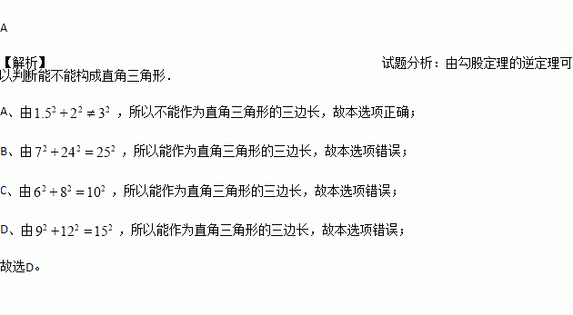 A. 1.5,2,3 B. 7,24,25 C. 6,8,10 D. 9,12,15