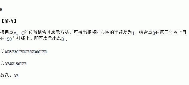 雷达二维平面定位的主要原理是:测量目标的两个信息﹣距离和角度,目标的表示方法为(m,α),其中,m表示目标与探测器的距离;α表示以正东为始边,逆时针旋转后的角度.如图,雷达探测器显示在点A,B,C处有目标出现,其中,目标A的位置表示为A(5,30°),目标C的位置表示为C(3,300°).用这种方法表示目标B的位置,正确的是( )