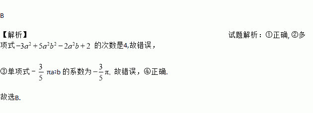 B 【解析】试题解析:①正确, ②多项式的次数是4,故错误, ③单项式﹣πa2b 的系数为故错误,④正确. 故选B.
