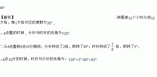 65° 【解析】∵钟面被12个小时分成12大格,每1大格对应的度数为30°, ∴ 4点整的时候,分针与时针的夹角为120°. ∵从4点整到4点10分期间,分针转动了2格,即转了60°;时针转动了格,即转了5°, ∴4点10分的时候,时针与分针的夹角为:120°+5°-60°=65°.
