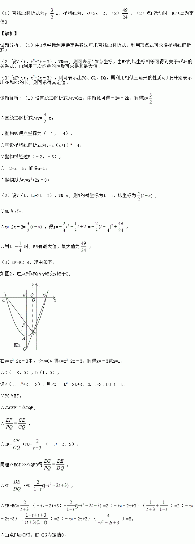 (3)如图2,过点A的直线交x轴于点E,且AE∥y轴,点P是抛物线上A、D之间的一个动点,直线PC、PD与AE分别交于F、G两点.当点P运动时,EF+EG是否为定值?若是,试求出该定值;若不是,请说明理由.