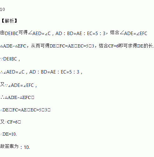 在 △ABC中,DE∥BC, ∠ADE=∠EFC,AD∶BD=5∶3,CF=6,则DE的长为__________.![]()