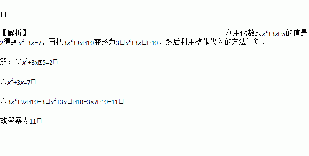 11 【解析】利用代数式x2+3x﹣5的值是2得到x2+3x=7,再把3x2+9x﹣10变形为3(x2+3x)﹣10,然后利用整体代入的方法计算. 【解析】 ∵x2+3x﹣5=2, ∴x2+3x=7, ∴3x2+9x﹣10=3(x2+3x)﹣10=3×7﹣10=11. 故答案为11.