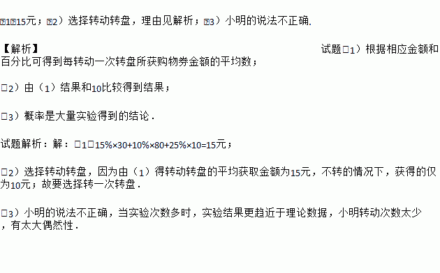 (1)每转动一次转盘所获购物券金额的平均数是多少?
