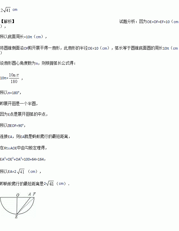 如图是一个用来盛爆米花的圆锥形纸杯,纸杯开口圆的直径EF长为10 cm,母线OE(OF)长为10 cm.在母线OF上的点A处有一块爆米花残渣,且FA = 2 cm,一只蚂蚁从杯口的点E处沿圆锥表面爬行到A点,则此蚂蚁爬行的最短距离为_________.