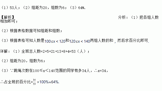 (3)跳绳次数在100≤x<140范围内同学有多少人,占全班的百分之几(精确到0.01%)?