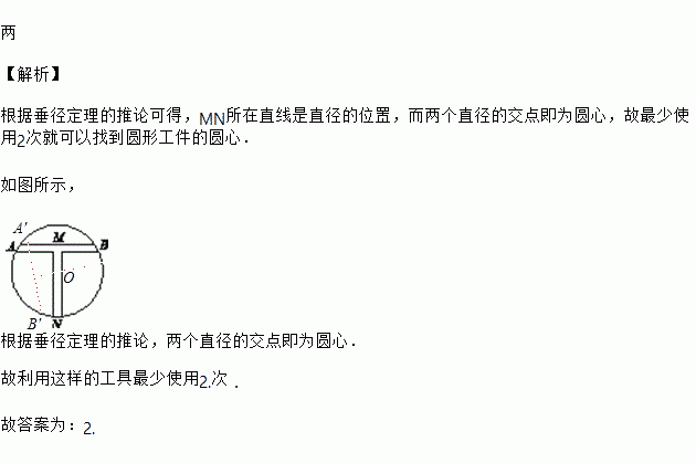 如图,MN所在的直线垂直平分线段AB,利用这样的工具,最少使用________ 次就可以找到圆形工件的圆心.