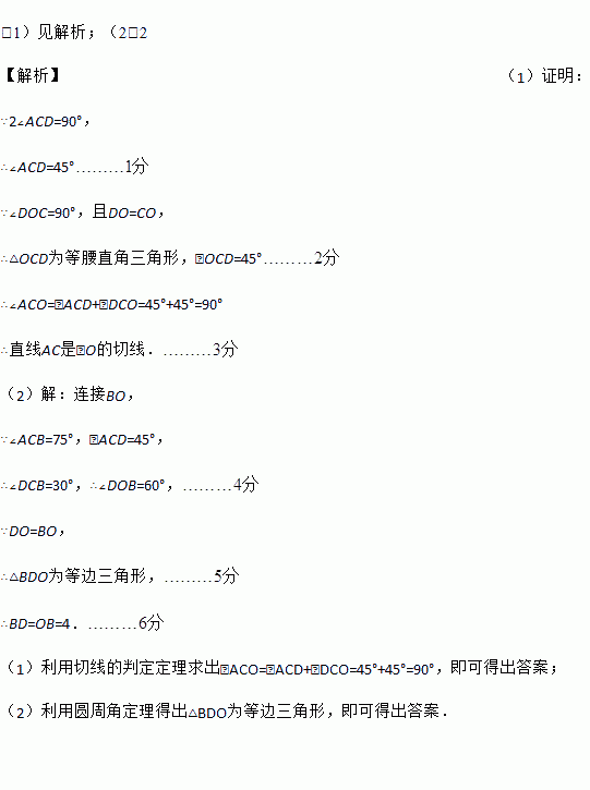 (2)如果∠ACB=75°,圆O的半径为2,求BD的长.