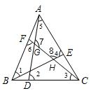 .分析:利用三角形的内角和外角的关系,将∠2、∠3和∠1、∠6转化到四边形AGHE内,再利用四边形的内角定理解答.