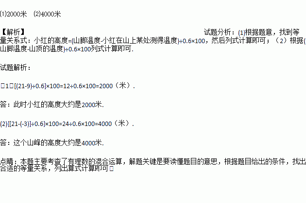 ⑵小红在山顶测得温度是-30C,这个山峰的高度大约是多少米?
