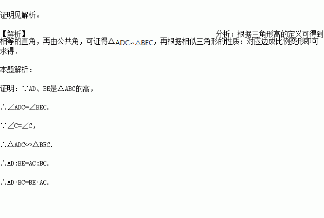 如图,已知AD、BE是△ABC的两条高,试证明AD·BC=BE·AC