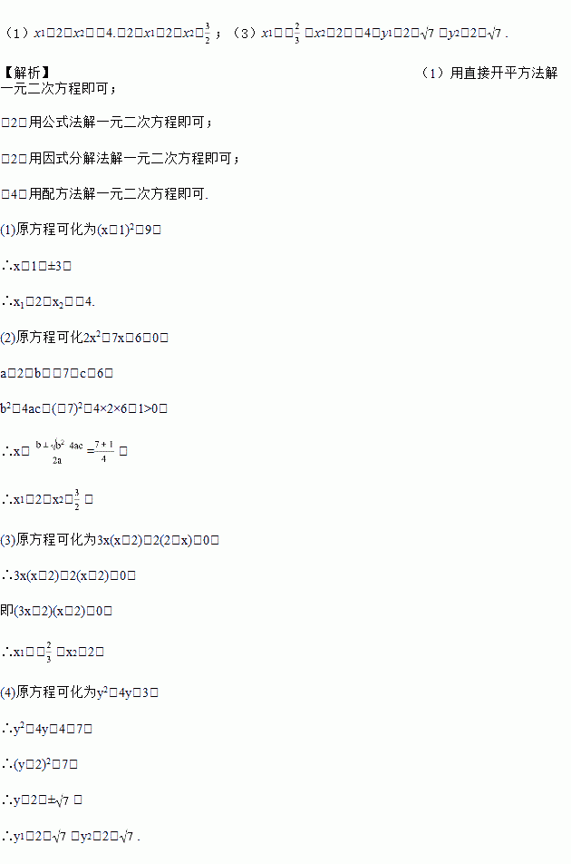 (3)3x(x-2)=2(2-x); (4)y2-4y-3=0.