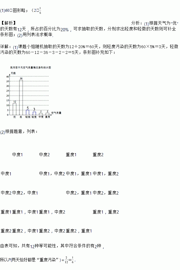 (2)为找出优化环境的措施,“环境治理研讨小组”的同学欲从天气质量为“中度污染”和“重度污染”的样本中随机抽取两天分析污染原因,请用列表或画树状图的方法求出所抽取的两天恰好都是“重度污染”的概率.