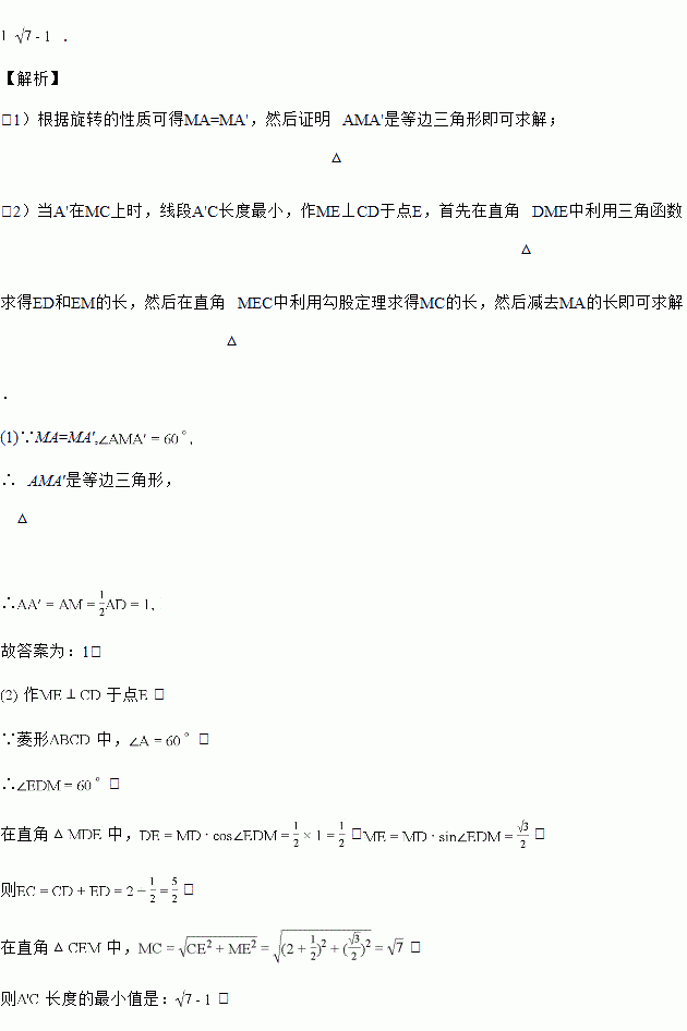 在边长为的菱形中,,是边的中点,若线段绕点旋转得到线段