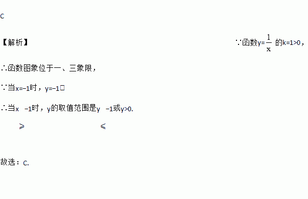 C 【解析】∵函数y=的k=1>0, ∴函数图象位于一、三象限, ∵当x=?1时,y=?1, ∴当x??1时,y的取值范围是y??1或y>0. 故选:C.