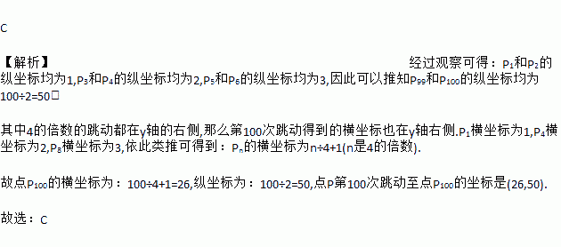 如图,在平面直角坐标系xOy中,点P(1,0).点P第1次向上跳动1个单位至点P1(1,1),紧接着第2次向左跳动2个单位至点P2(-1,1),第3次向上跳动1个单位至点P3,第4次向右跳动3个单位至点P4,第5次又向上跳动1个单位至点P5,第6次向左跳动4个单位至点P6,…….照此规律,点P第100次跳动至点P100的坐标是( )