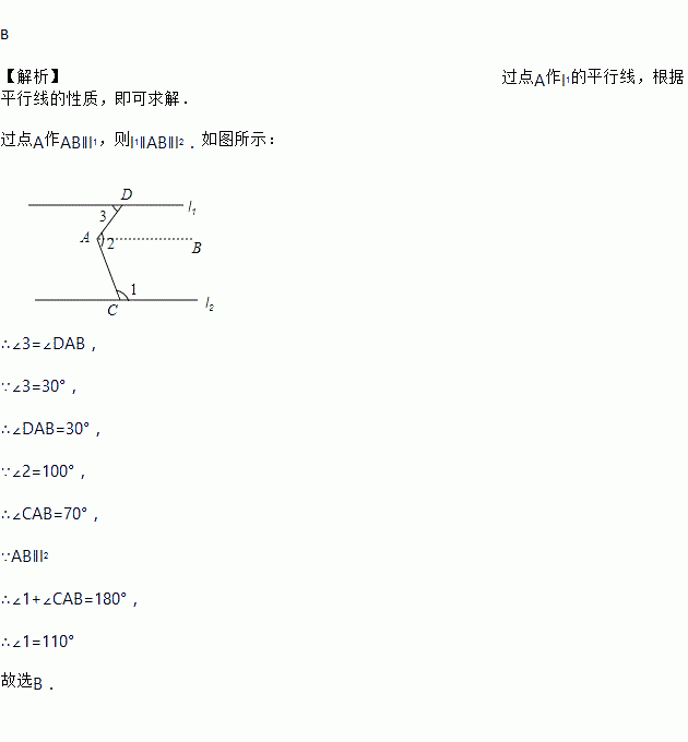如图,l1∥l2,∠3=30°,∠2=100°,则∠1=( )