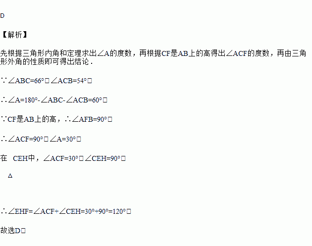 在△ABC中,已知∠ABC=66°,∠ACB=54°,BE是AC上的高,CF是AB上的高,H是BE和CF的交点,∠EHF的度数是( )