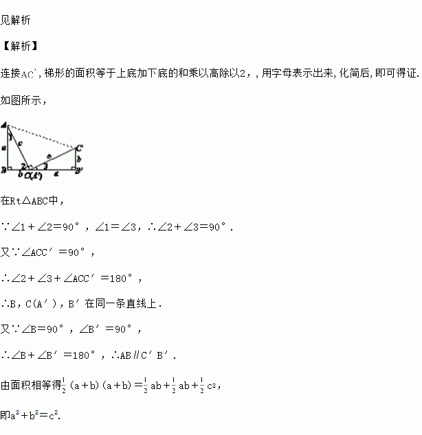 在直角三角形中,两条直角边的长度分别为a和b,斜边长度为c,则a2+b2=c2,即两条直角边的平方和等于斜边的平方,此结论称为勾股定理.在一张纸上画两个同样大小的直角三角形ABC和A′B′C′,并把它们拼成如图所示的形状 (点C和A′重合,且两直角三角形的斜边互相垂直).请利用拼得的图形证明勾股定理.