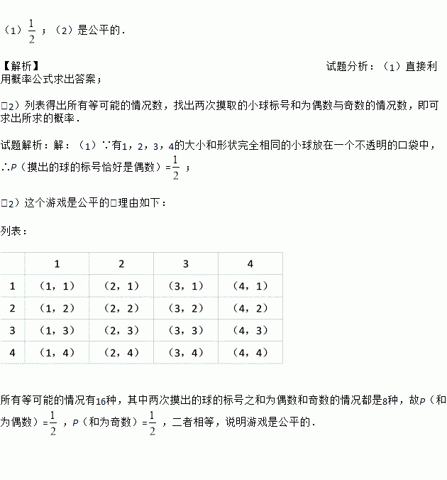 (2)从袋中随机摸出一球后放回,摇匀后再随机摸出一球,若两次摸出的球的标号之和为偶数时,则甲胜;若两次摸出的球的标号之和为奇数时,则乙胜;试分析这个游戏是否公平?请说明理由.