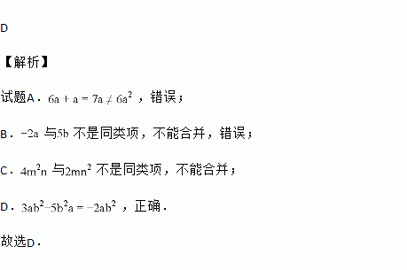 A. 6a+a=6a2 B. -2a+5b=3ab C. 4m2n-2mn2=2mn D. 3ab2-5b2a=-2ab2