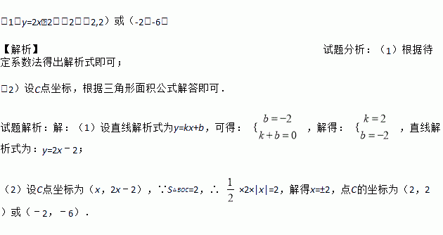 (1)y=2x﹣2;(2)(2,2)或(-2,-6) 【解析】试题分析:(1)根据待定系数法得出解析式即可; (2)设C点坐标,根据三角形面积公式解答即可. 试题解析:【解析】 (1)设直线解析式为y=kx+b,可得: ,解得: ,直线解析式为:y=2x﹣2; (2)设C点坐标为(x,2x﹣2),∵S△BOC=2,∴ ×2×|x|=2,解得x=±2,点C的坐标为(2,2)...