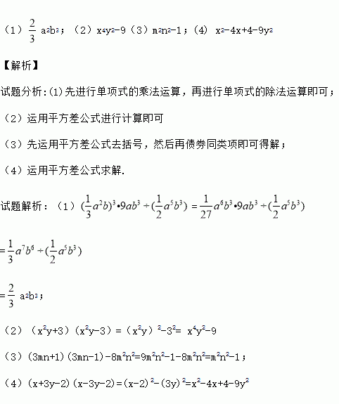 (1)a2b3;(2)x4y2-9(3)m2n2-1;(4) x2-4x+4-9y2 【解析】 试题分析:(1)先进行单项式的乘法运算,再进行单项式的除法运算即可; (2)运用平方差公式进行计算即可 (3)先运用平方差公式去括号,然后再债券同类项即可得解; (4)运用平方差公式求解. 试题解析:(1)= = =a2b3; (2)(x2y+3)(...