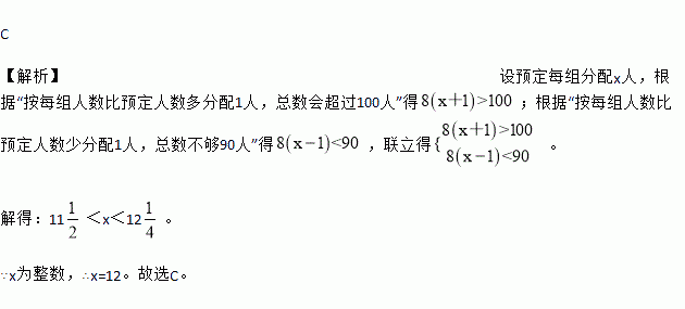 在芦山地震抢险时,太平镇部分村庄需8组战士步行运送物资,要求每组分配的人数相同,若按每组人数比预定人数多分配1人,则总数会超过100人;若按每组人数比预定人数少分配1人,则总数不够90人,那么预定每组分配的人数是( )