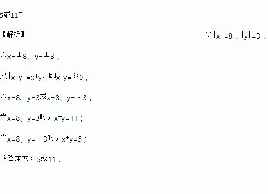 已知|x|=8,|y|=3,|x+y|=x+y,则x+y=_____
